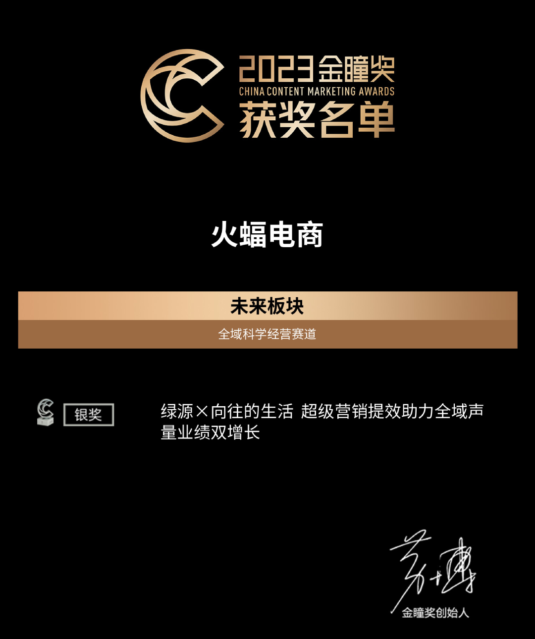 據了解,金瞳獎(2011——至今)是由中國商務廣告協會(CAAC)指導,傳播行業平臺“廣告門”主辦,對內容及內容營銷領域進行商業價值認定的權威獎項。本屆金瞳獎共設置「原創內容」、「內容營銷」、「未來板塊」三大獎項單元,讓更多符合時代需要、引領行業發展的好內容、好作品有機會被行業看見、了解和學習。評審團匯集了來自代理公司、頭部互聯網營銷平臺及品牌方在內的140余位行業影響力人物,對1211件入圍作品進行激烈討論和評選。火蝠電商憑借創意力與洞察力榮獲2023金瞳獎【最具數智經營力品牌——銀獎】榮譽,并攜手品牌方—